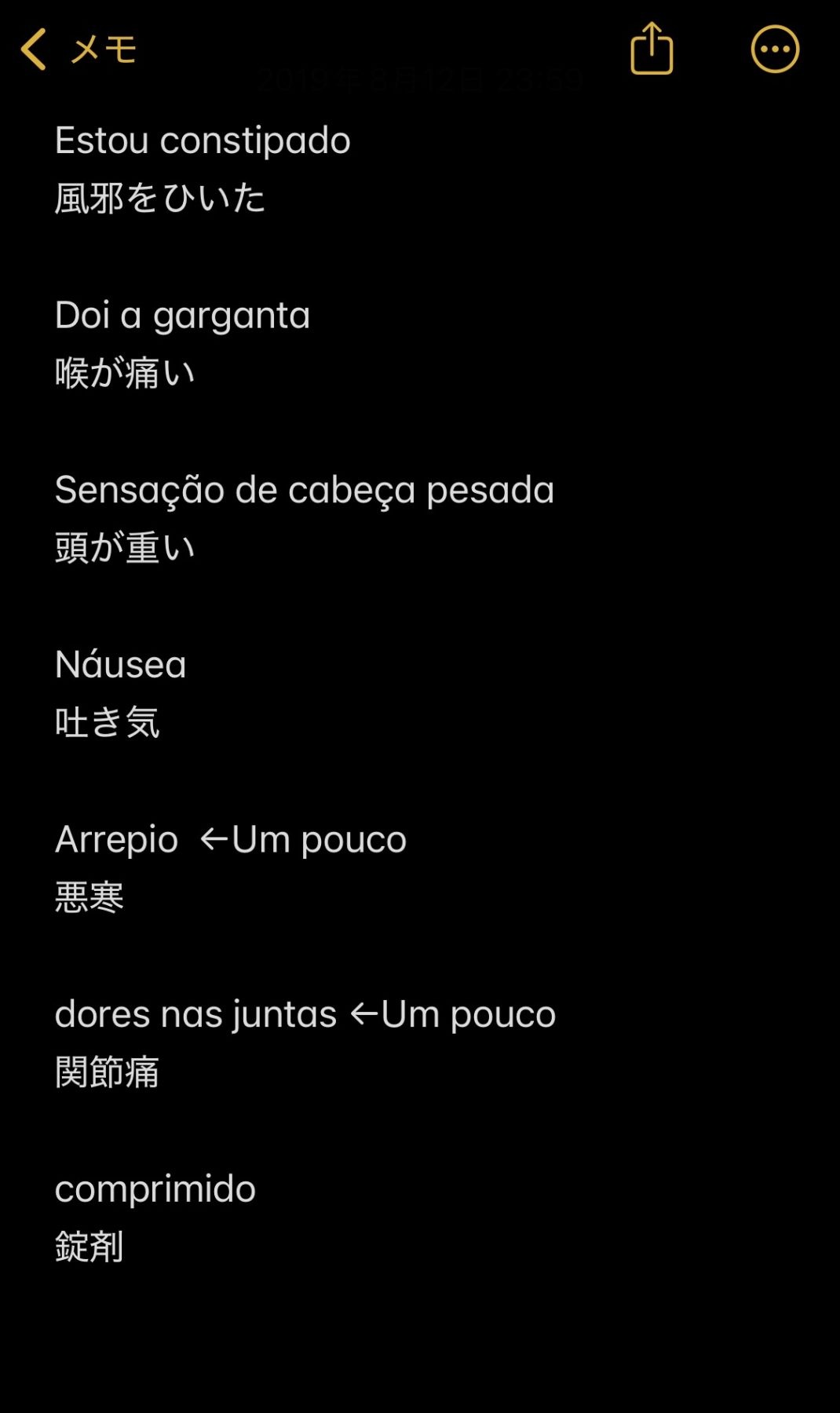 症状をポルトガル語でなんて言うかを検索して、それをメモ帳に貼り付け薬剤師さんに画面を見せながらお薬くださいと伝える。